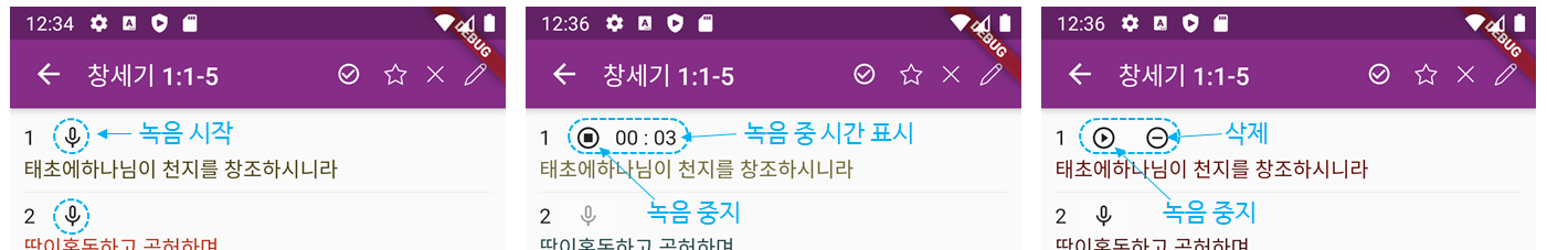 보기화면의 경우 아래 왼쪽 이미지처럼 절 번호마다 옆에 녹음 버튼이 있습니다.